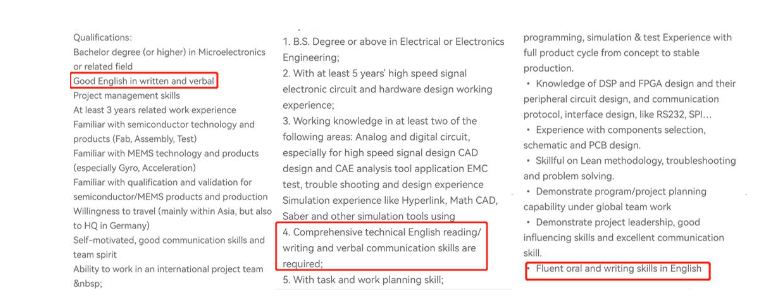 毫無疑問,當今電子行業(yè)站在世界前列的仍然是國外。工程師在做硬件設計的時候,需要閱讀大量的外文資料。有的工程師英語基礎薄弱,閱讀的時候使用翻譯軟件逐行翻譯,效率很低。你如果精通英文,可以直接閱讀世界上先進的技術(shù)文檔,用流利的口語與世界各地的工程師對話,在專業(yè)和職業(yè)上得到的機會也會更多。