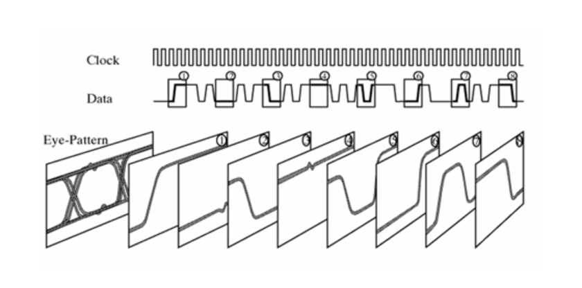 在用示波器觀察傳輸?shù)臄?shù)據(jù)信號時,使用被測系統(tǒng)的定時信號,通過示波器外觸發(fā)或外同步對示波器的掃描進(jìn)行控制,由于掃描周期此時恰為被測信號周期的整數(shù)倍,因此在示波器熒光屏上觀察到的就是一個由多個隨機(jī)符號波形共同形成的穩(wěn)定圖形。這種圖形看起來象眼睛,稱為數(shù)字信號的眼圖。一個完整的眼圖應(yīng)該包含“000”到“111”的所有狀態(tài)組,8種狀態(tài)形成眼圖的過程如下圖所示: