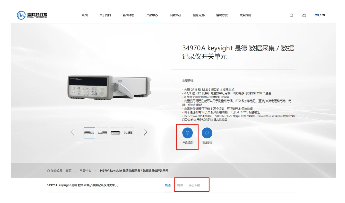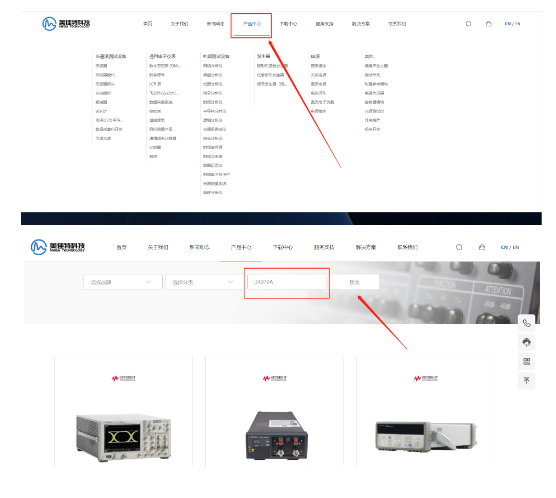 步驟二:點擊導航欄上“產(chǎn)品中心”,進入產(chǎn)品中心頁面,輸入需要查詢的產(chǎn)品型號,例:34970A。點擊搜索即可