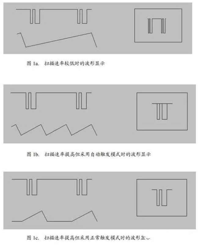 圖1c中的掃描速率與圖1b相同,但采用正常觸發(fā)方式,僅在有觸發(fā)時才進行掃描,因而顯示清晰的波形。