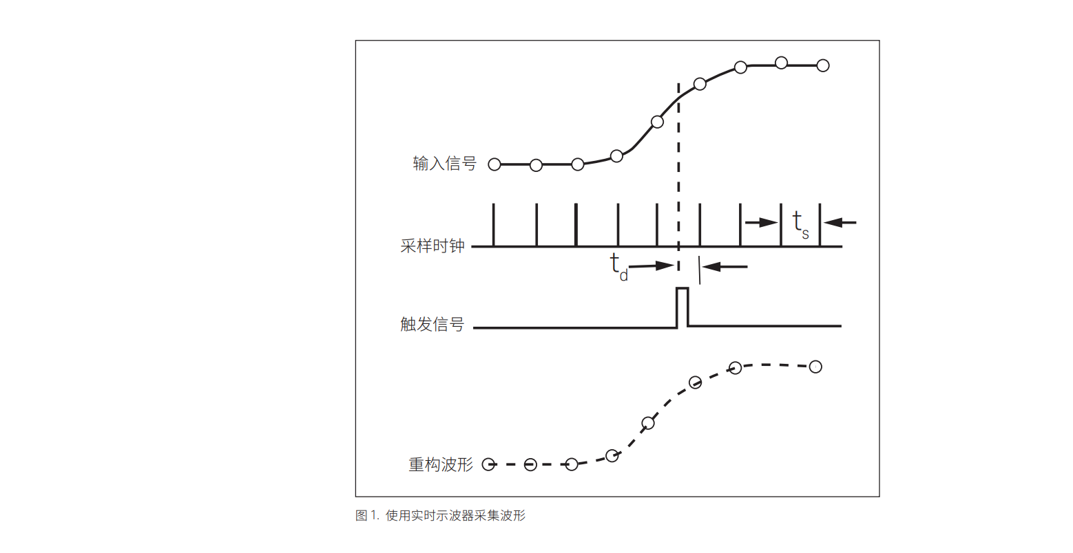 實(shí)時(shí)示波器可以根據(jù)數(shù)據(jù)本身的特征觸發(fā),通常是在輸入波形的幅度達(dá)到某個(gè)閾值 時(shí)發(fā)生觸發(fā)。這時(shí),示波器開始將模擬波形異步轉(zhuǎn)換為數(shù)字?jǐn)?shù)據(jù)樣點(diǎn),轉(zhuǎn)換速率與 輸入波形的數(shù)據(jù)速率無(wú)關(guān)。該轉(zhuǎn)換速率稱為采樣率,通常來(lái)自內(nèi)部時(shí)鐘信號(hào)。如圖 1 所示,示波器對(duì)輸入波形的幅度進(jìn)行采樣,將采樣值保存到存儲(chǔ)器中,然后繼續(xù) 進(jìn)行下一次采樣。觸發(fā)器的主要任務(wù)是為輸入的數(shù)據(jù)提供一個(gè)水平時(shí)間參考點(diǎn)。