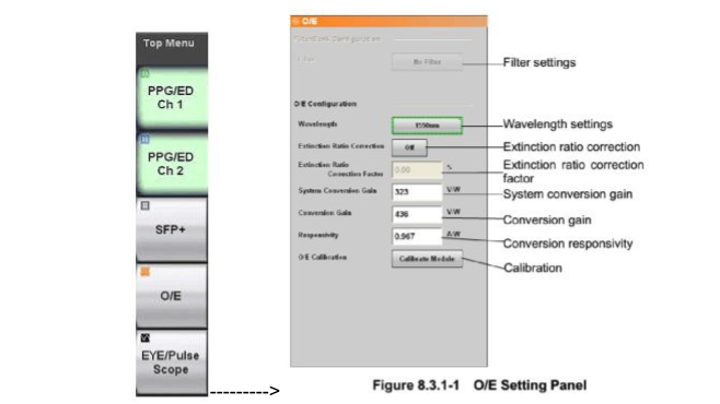 在儀表操作界面的頂端菜單上選擇 O/E, 可以打開光接口參數的相關設置, 如圖。選擇 Filter (濾波器)、