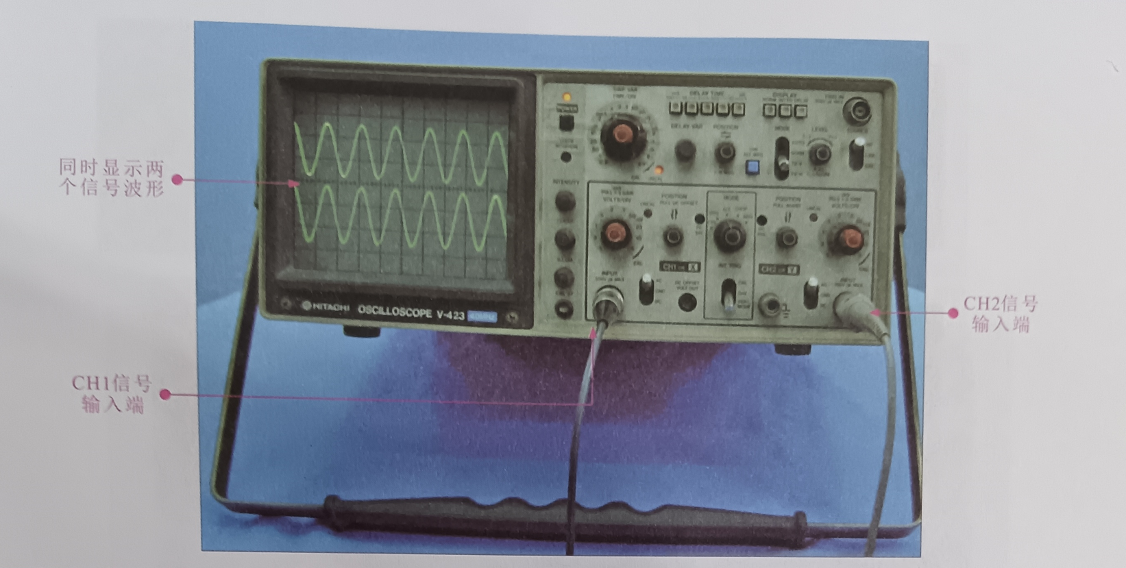 (4)CH2信號輸入端 (INPUT 300V pk MAX) : 用來連接示波器 CH2 測試線。兩個輸入端可以單獨使用,也可以同時使用,如圖為 CHI和 CH2 兩個輸入端同時輸入信號波形。