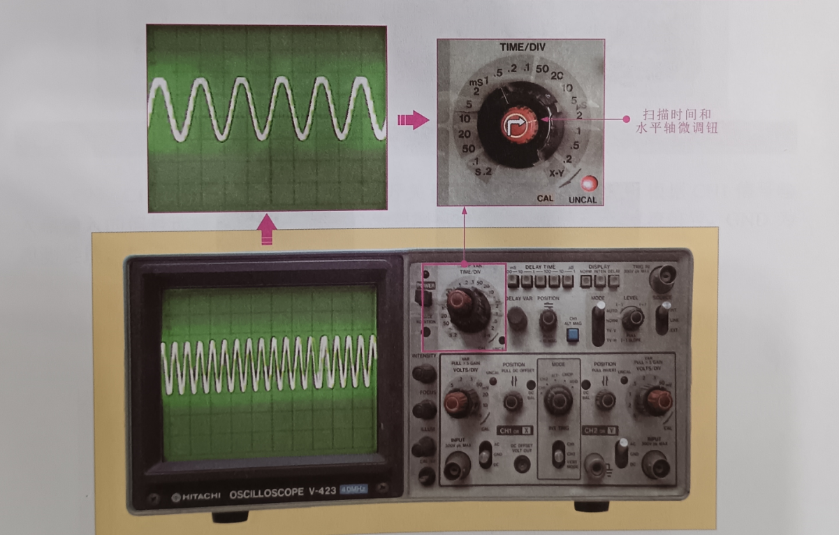 (5)掃描時間和水平軸微調(diào)鈕(SWP VAR TIME/DIV 用于調(diào)節(jié)掃描時間,如圖所示。
