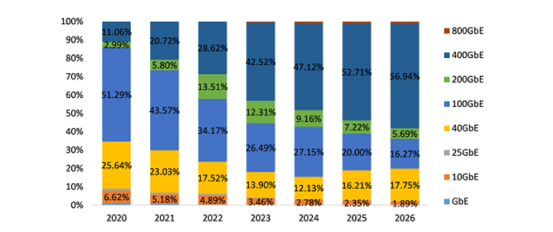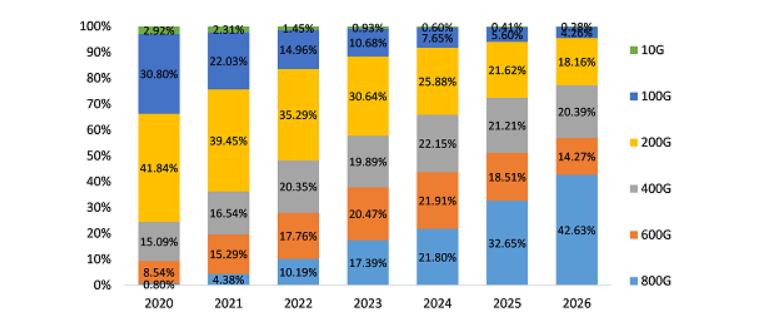 圖1:不同速率DWDM模塊滲透率發(fā)展趨勢(按出貨量)