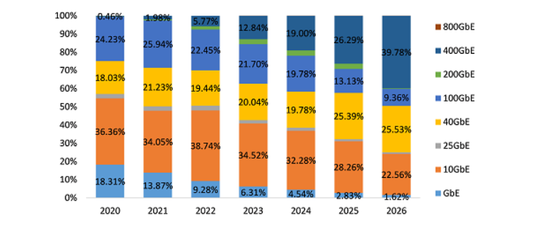 在數(shù)據(jù)通信領(lǐng)域,即將到來的數(shù)據(jù)中心架構(gòu)將刺激該市場投資的長期增長。Omidia預(yù)測顯示,2020年,10GbE及以下數(shù)據(jù)通信光模塊出貨量占據(jù)整體數(shù)據(jù)通信光模塊出貨量的54.67%,到2026年,該比例將下滑至24.18%;同時,40GbE光模塊出貨量的占比從18.03%上升至25.53%,100GbE光模塊出貨量占比從24.23%下滑至9.36%,400GbE光模塊出貨量占比將從0.46%上升至39.78%。800GbE光模塊預(yù)計將于2023年面世,其銷量預(yù)計將在2025年及之后快速攀升。