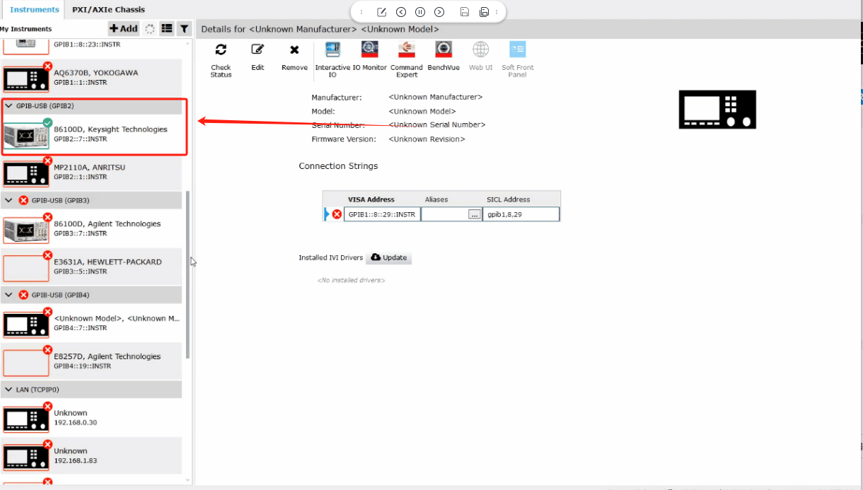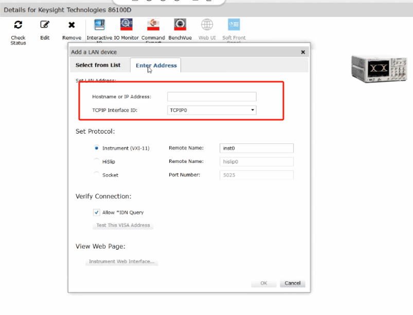 ?  Keysight IO Libraries Suite軟件:這是一款通用的儀器驅(qū)動(dòng)和通信軟件,可以幫助您識(shí)別和配置86100D等Keysight儀器。該軟件可以為86100D分配一個(gè)VISA地址,以便通過USB或LAN進(jìn)行通信。