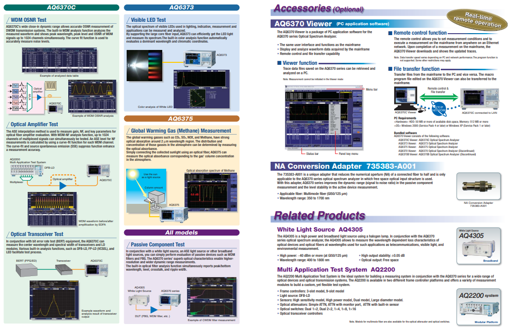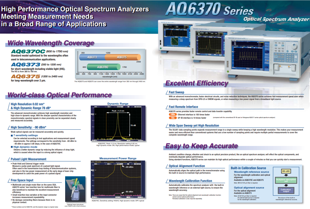 AQ6370C可以用于光有源器件、光無(wú)源器件、光傳輸設(shè)備等的測(cè)試和研發(fā),AQ6370C是一款光譜分析儀,由橫河計(jì)量?jī)x表公司生產(chǎn),于2014年停產(chǎn):