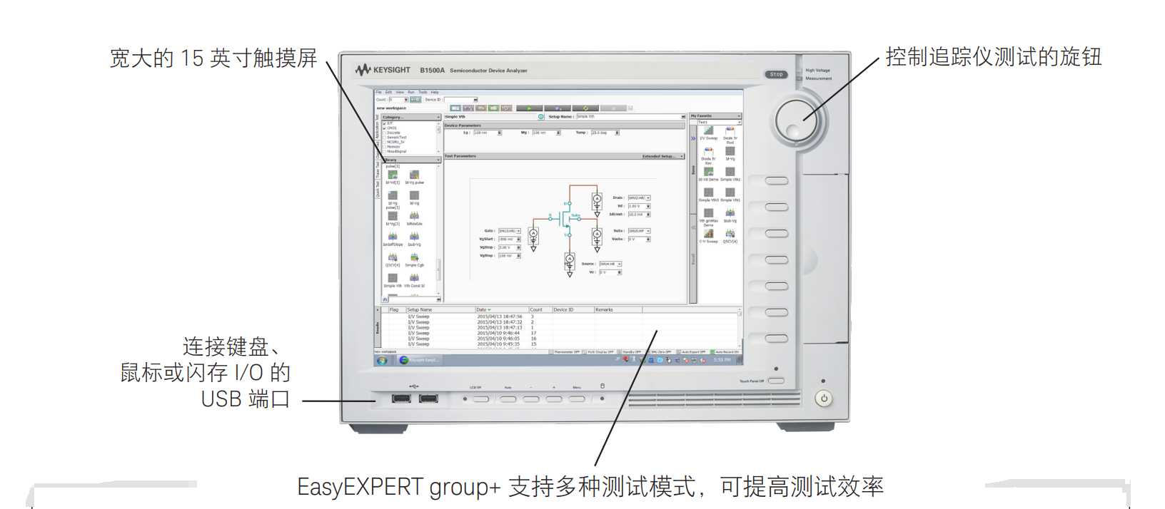 4. EasyEXPERT group+軟件:B1500A配備了基于嵌入式Windows 10平臺(tái)的居民GUI(圖形用戶界面)軟件,即EasyEXPERT group+,支持高效且可重復(fù)的設(shè)備表征。