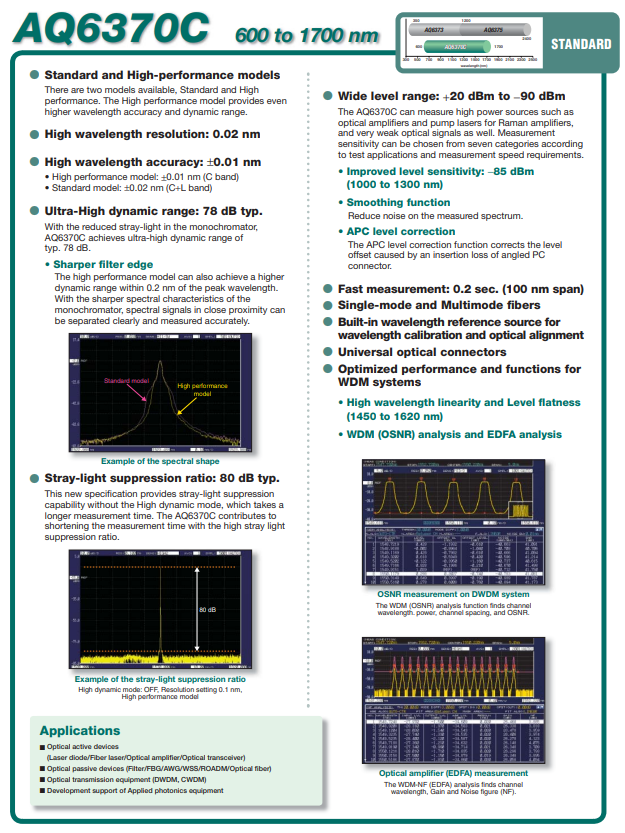 AQ6370C是一款功能強(qiáng)大、測(cè)量速度快、精度高的光譜分析儀,適用于光通信設(shè)備和器件的光學(xué)特性測(cè)量,以及光纖激光器等高功率光源的測(cè)試。