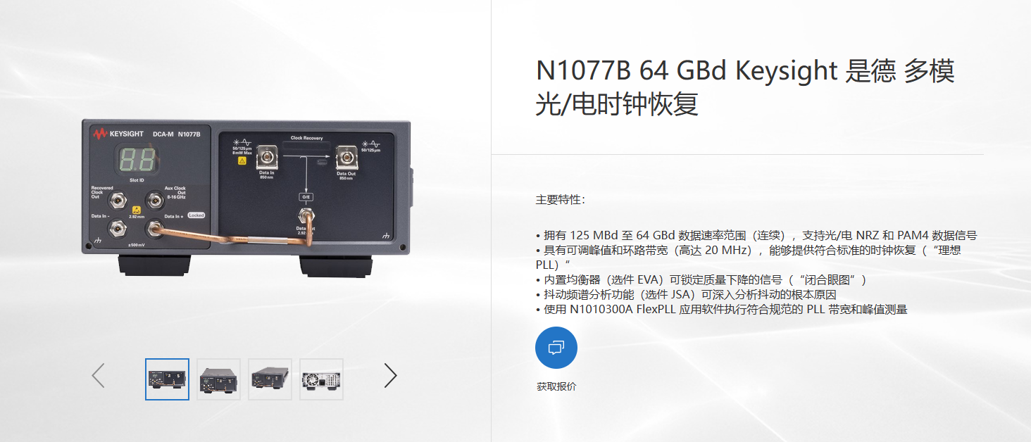 Keysight N1077B是一款光/電時(shí)鐘恢復(fù)設(shè)備,支持115 MBd至24 GBd的數(shù)據(jù)速率范圍,適用于多模和單模光信號(hào)以及電信號(hào)。該設(shè)備能夠處理PAM4和NRZ兩種類型的數(shù)據(jù)信號(hào),并提供符合標(biāo)準(zhǔn)的時(shí)鐘恢復(fù)功能。