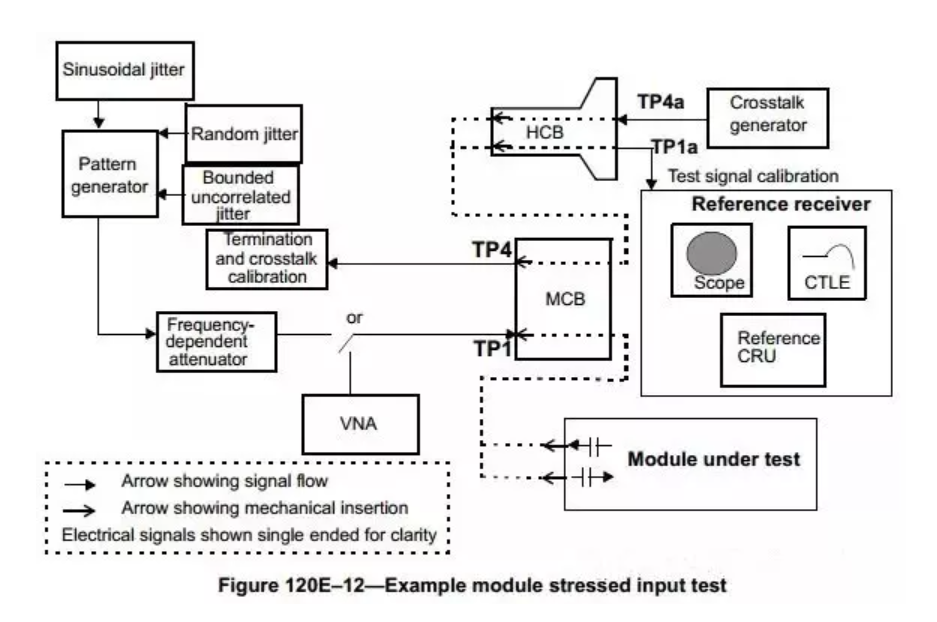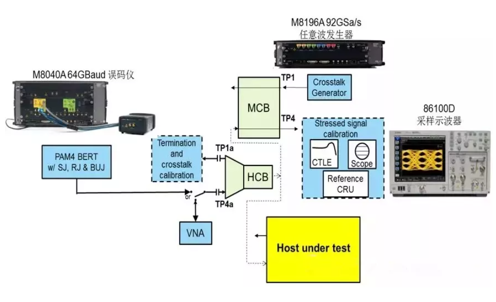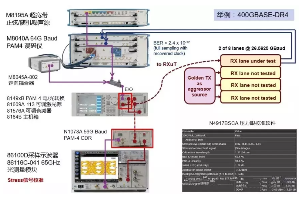 • 測(cè)試環(huán)境:參考的PAM4信號(hào)源與抖動(dòng)、噪聲、碼間干擾注入源,以及參考的光發(fā)射機(jī)產(chǎn)生所需的光壓力信號(hào)。