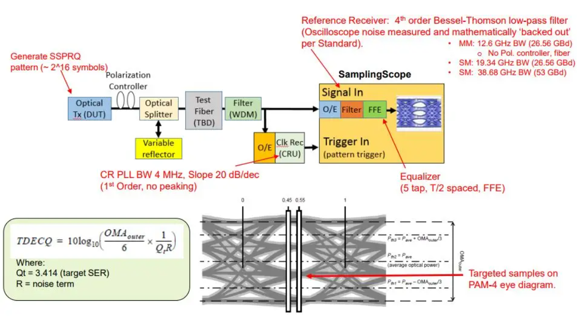 • 關(guān)鍵指標(biāo):TDECQ(Transmitter and dispersion eye closure for PAM4),衡量光發(fā)射機(jī)經(jīng)過(guò)光通道后PAM4信號(hào)功率裕量的損失。TDECQ的參考測(cè)試方法如下圖所示: