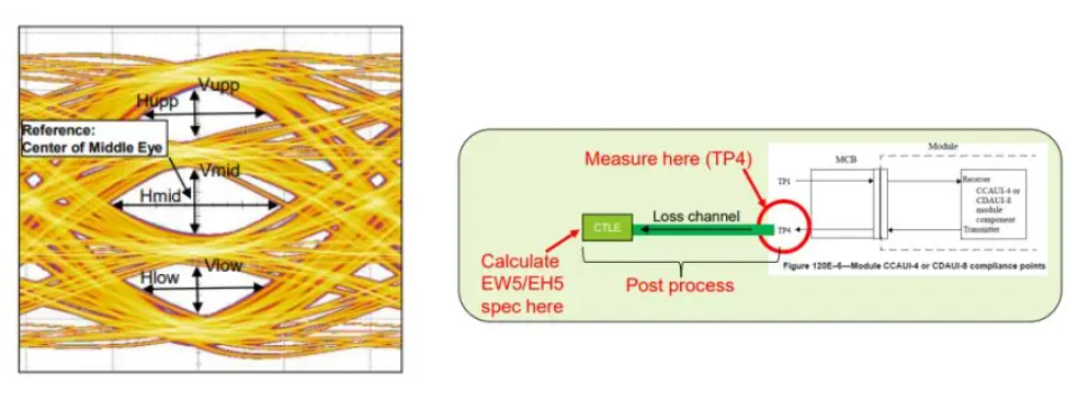 • 測(cè)試內(nèi)容:PAM4電壓力信號(hào)由眼圖對(duì)稱(chēng)模板寬度ESMW,眼寬EW,眼高EH和附加正弦抖動(dòng)SJ的頻率和幅度來(lái)表征。