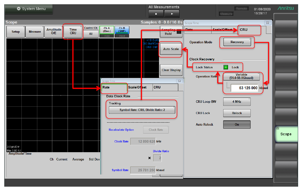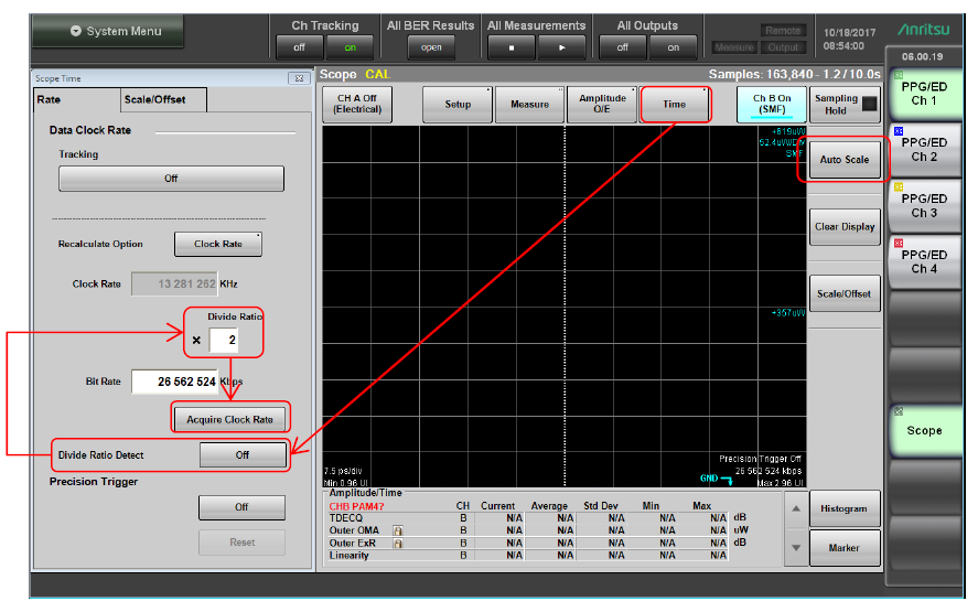 2.檢查Trigger時(shí)鐘 Divide Ratio: - 26Gbaud Signal: 1/2, 1/4, 1/8, 1/16 - 53Gbaud Signal: 1/4, 1/8, 1/16, 1/32, 1/40 (當(dāng)選擇Coherent Eye 模式Pulse 模式.)