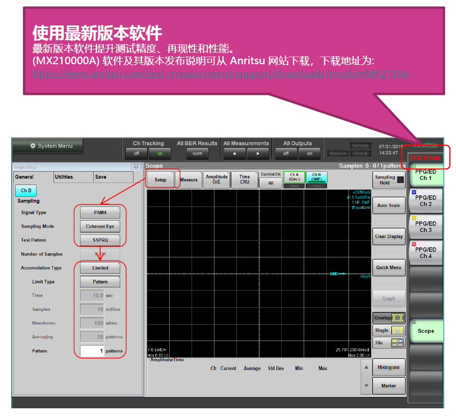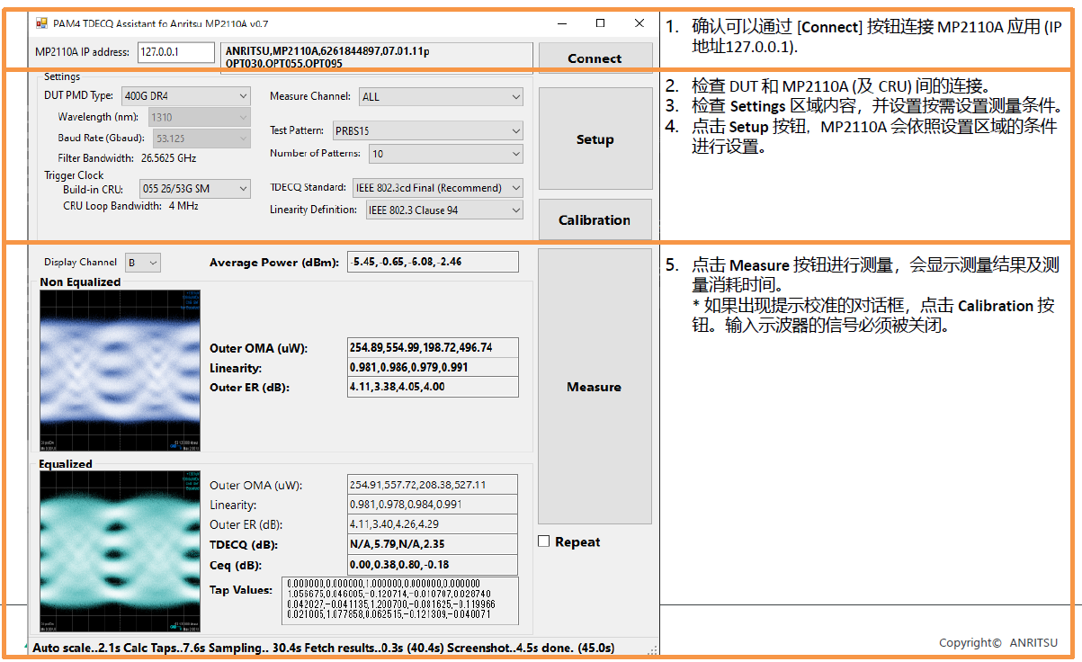 本文檔提供了關(guān)于ANRITSU MP2110A測(cè)試設(shè)備的操作說明,涵蓋了連接、設(shè)置、校準(zhǔn)以及TDECQ測(cè)量的詳細(xì)步驟。本文內(nèi)容包括:MP2110A的主要特性,如其時(shí)鐘恢復(fù)功能和可用于各種高速通信標(biāo)準(zhǔn)的測(cè)試能力。MP2110A通過物理連接、軟件設(shè)置和校準(zhǔn)等步驟來進(jìn)行TDECQ測(cè)試的過程。針對(duì)常見測(cè)試問題的排查指南,比如測(cè)試結(jié)果顯示異常時(shí)應(yīng)檢查的設(shè)置參數(shù)和潛在故障點(diǎn)。及一個(gè)輔助工具——TDECQ Assistant,可幫助用戶簡(jiǎn)化測(cè)試設(shè)置和測(cè)量過程。本文檔為用戶提供一套完整的操作流程和故障排除方法,確保能夠有效地使用MP2110A進(jìn)行高質(zhì)量的高速通信標(biāo)準(zhǔn)測(cè)試。