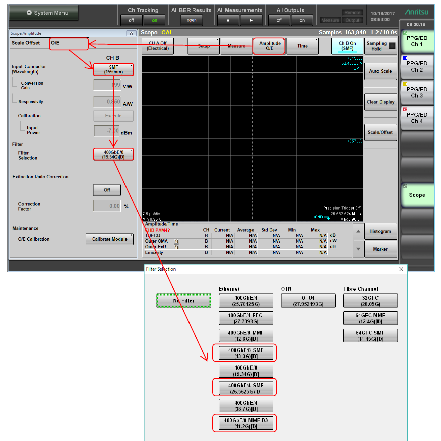 (3)選擇 Amplitude/OE 及 OE 標(biāo)簽。設(shè)置 Input Connector (Wavelength) 并依照下表選擇 Filter。*濾波器名稱中包含[D] 的為數(shù)字濾波器。數(shù)字濾波器僅在設(shè)置為 Coherent Eye 和 Pattern 時(shí)方可被選擇。
