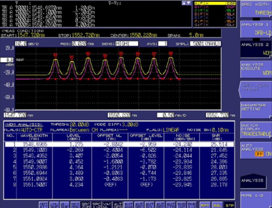 選擇高分辨率、大動(dòng)態(tài)范圍的光譜儀對(duì)精確分析DWDM的OSNR至關(guān)重要。AQ6370D的最高分辨率為0.02nm,動(dòng)態(tài)范圍大于78dB,可有效準(zhǔn)確測(cè)量信號(hào)燈和噪聲燈的功率,并結(jié)合正確的設(shè)置,確保OSNR的分析結(jié)果,是DWDM系統(tǒng)測(cè)量的理想選擇。