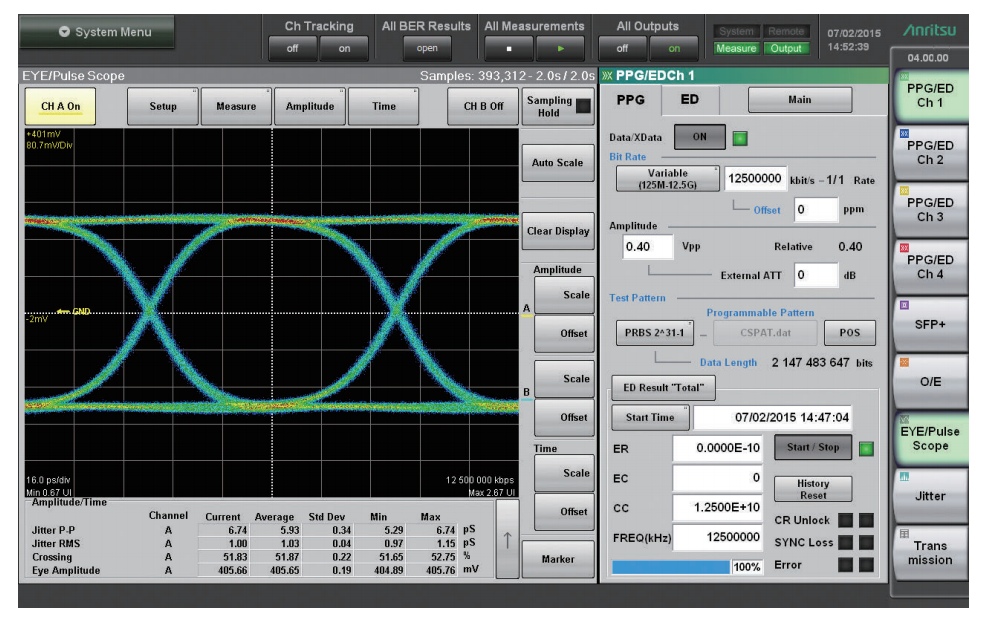 BERTWave MP2100B 的 BERT 能測(cè)量比特速率在 125 Mbit/s 到 12.5 Gbit/s 之間的誤碼率(BER),其內(nèi)置多達(dá) 4 通道的 BERT 選件使得 QSFP+ 和 AOC 等多通道光模塊測(cè)試系統(tǒng)的配置變得輕松簡(jiǎn)單。差分信號(hào)不但支持誤碼率(BER)測(cè)量,且支持眼圖模板測(cè)試和眼圖分析。