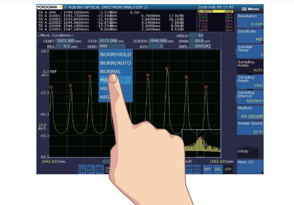 可提供十多種數(shù)據(jù)分析功能,包括WDM(OSNR)、SMSR、DFB-LD、EDFA和光譜寬度。
